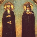 О, преподо́бнии и Богоно́снии отцы́, па́стырие и учи́телие и неле́ностнии наста́вницы на́ши! О земны́х небре́гше, в зе́млю кро́тких всели́лися есте́, из нея́же израсти́ли есте́ плоды́ доброде́телей; тле́нныя тала́нты не сокро́виществовавше, нетле́нныя тала́нты преумно́жили есте́ во сто крат и мно́жае; челове́ческия сла́вы теку́щия не иска́вше, возда́ли есте́ сла́ву Бо́гу и Спа́су всех и сего́ ра́ди прославля́етеся ны́не на Небесе́х в Це́ркви перворо́дных. Моли́те Человеколю́бца Спа́са Христа́, да просвети́т ны, помраче́нныя, покая́нием, да освяти́т ны, гре́шныя, си́лою, наи́тием и де́йствием благода́ти Свята́го Ду́ха, чрез достопокланя́емыя ико́ны подае́мою, да поми́лует ны, немощны́я, моли́твами ва́шими и предста́тельством Пренепоро́чныя Его́ Ма́тере и сподо́бит узре́ти сла́ву Пречи́стого ли́ка Своего́ во Ца́рствии Небе́снем. Ами́нь.